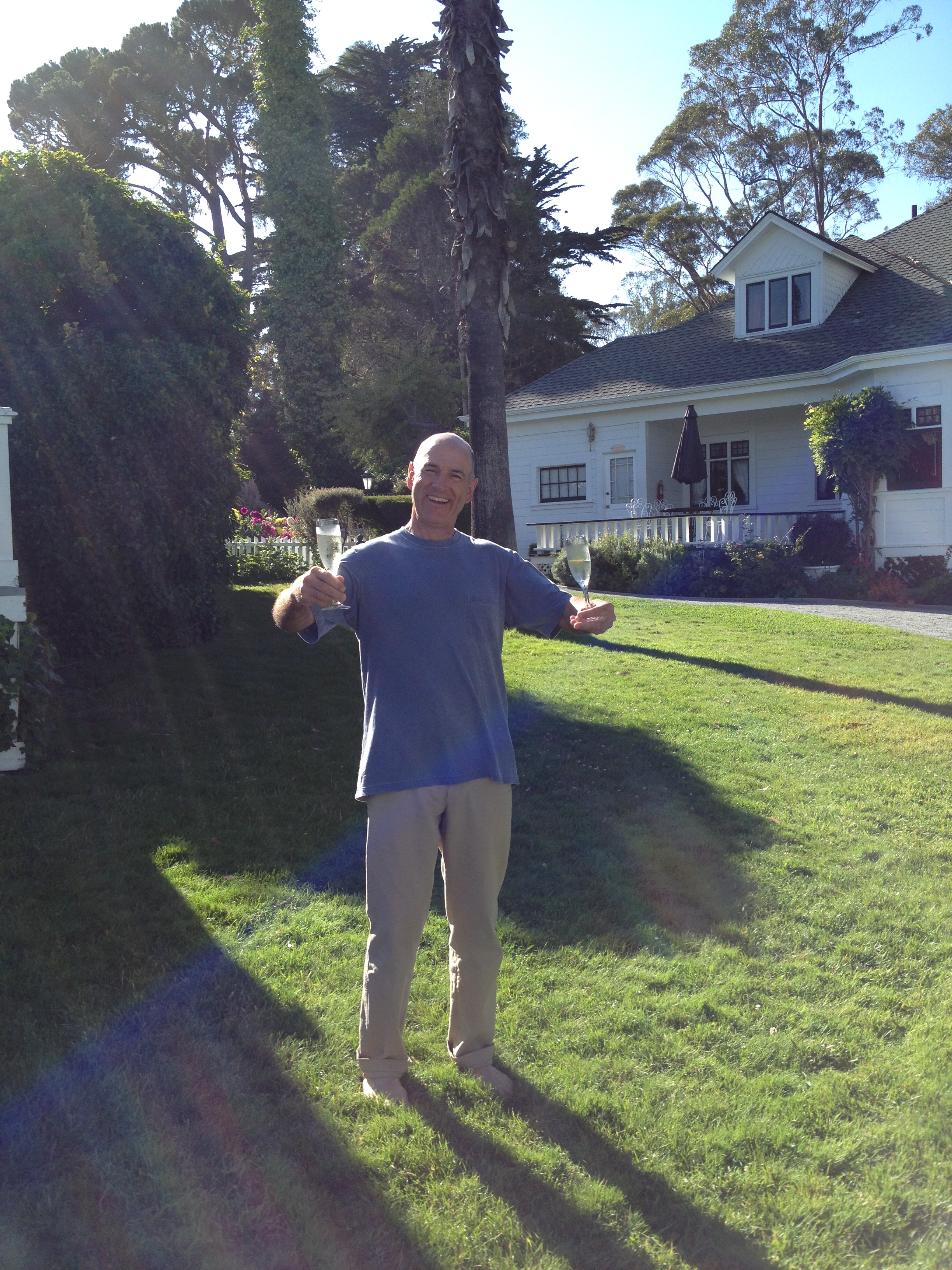 This past summer also saw the momentous occasion of my 50th birthday. John made sure he was home to celebrate with me, and he worked hard to make the event a wonderful celebration. There were parties, dinners out, and a night at a romantic cliffside bed and breakfast in Capitola. Capitola is the town where John was living when we started dating, in, well, a long time ago! Here he is in front of our room at the B&B bringing me sparkling wine for my birthday: